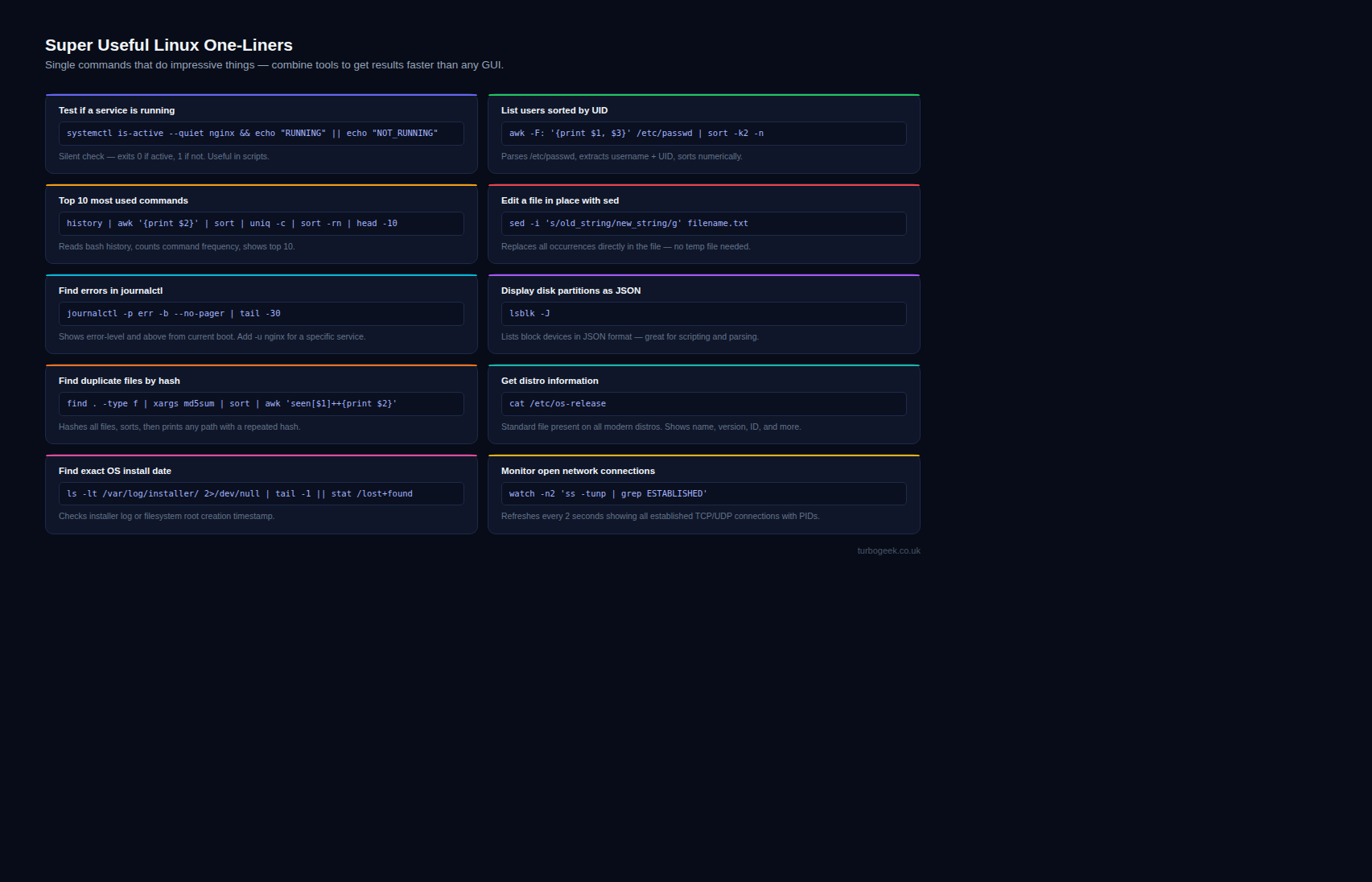 Here is a collection of super useful bash one-liners that resolve a hole world of issues you may encounter as a linux admin.