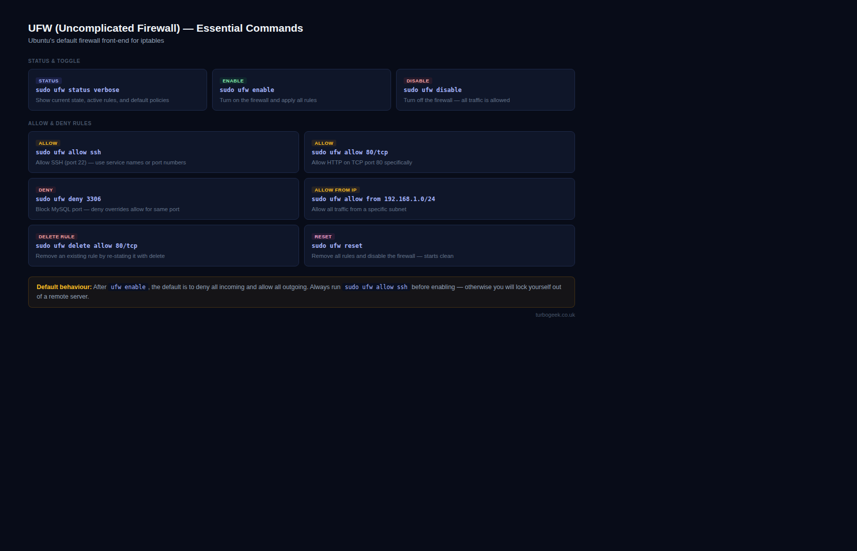 • Service: sudo ufw allow ssh (allows SSH connections)