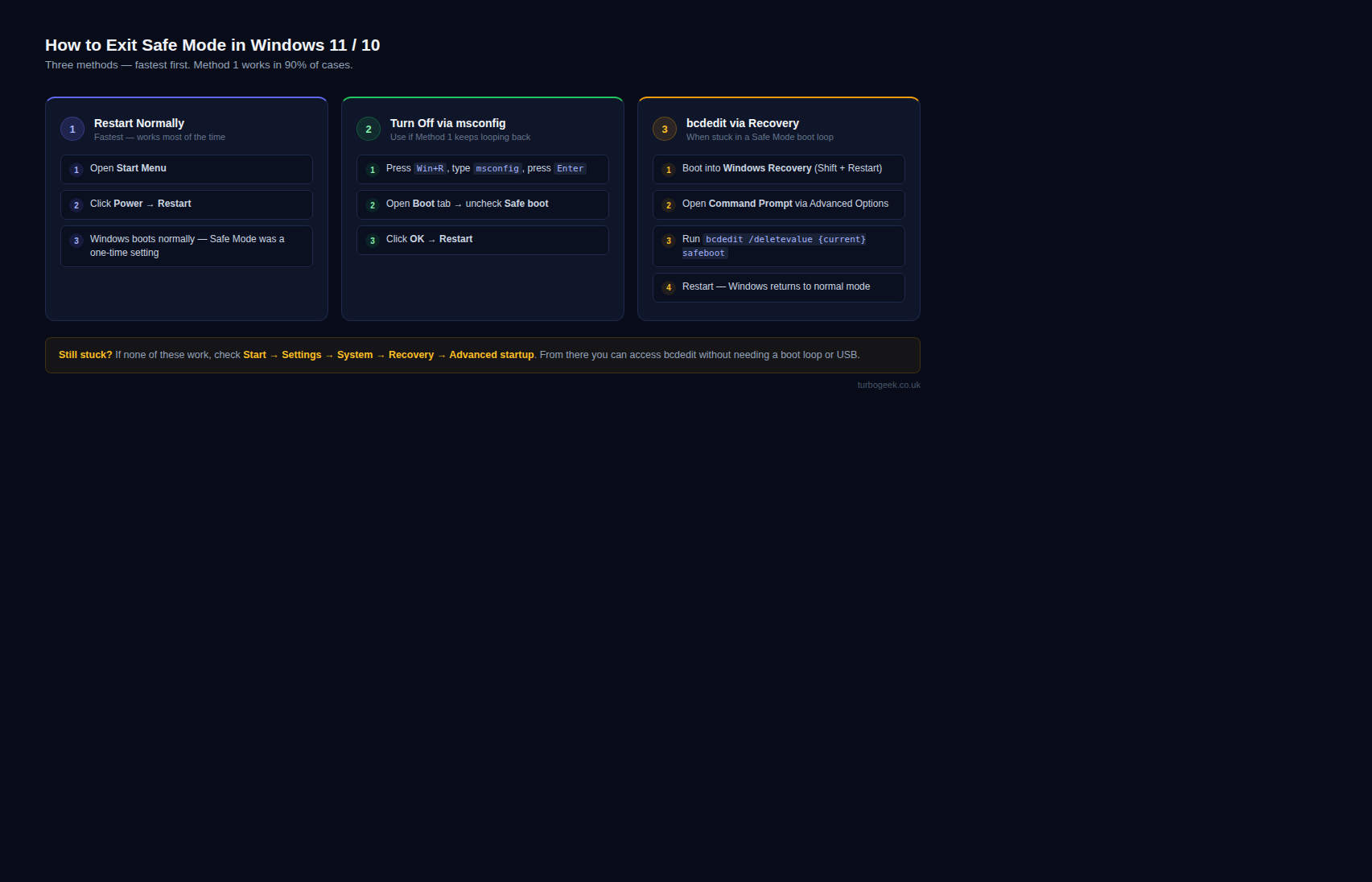 If you have not entered Safe Mode yet, start with How to Boot Windows into Safe Mode (Windows 11/10 Guide). If you are already in Safe Mode and want to leave it, follow the methods below in order.