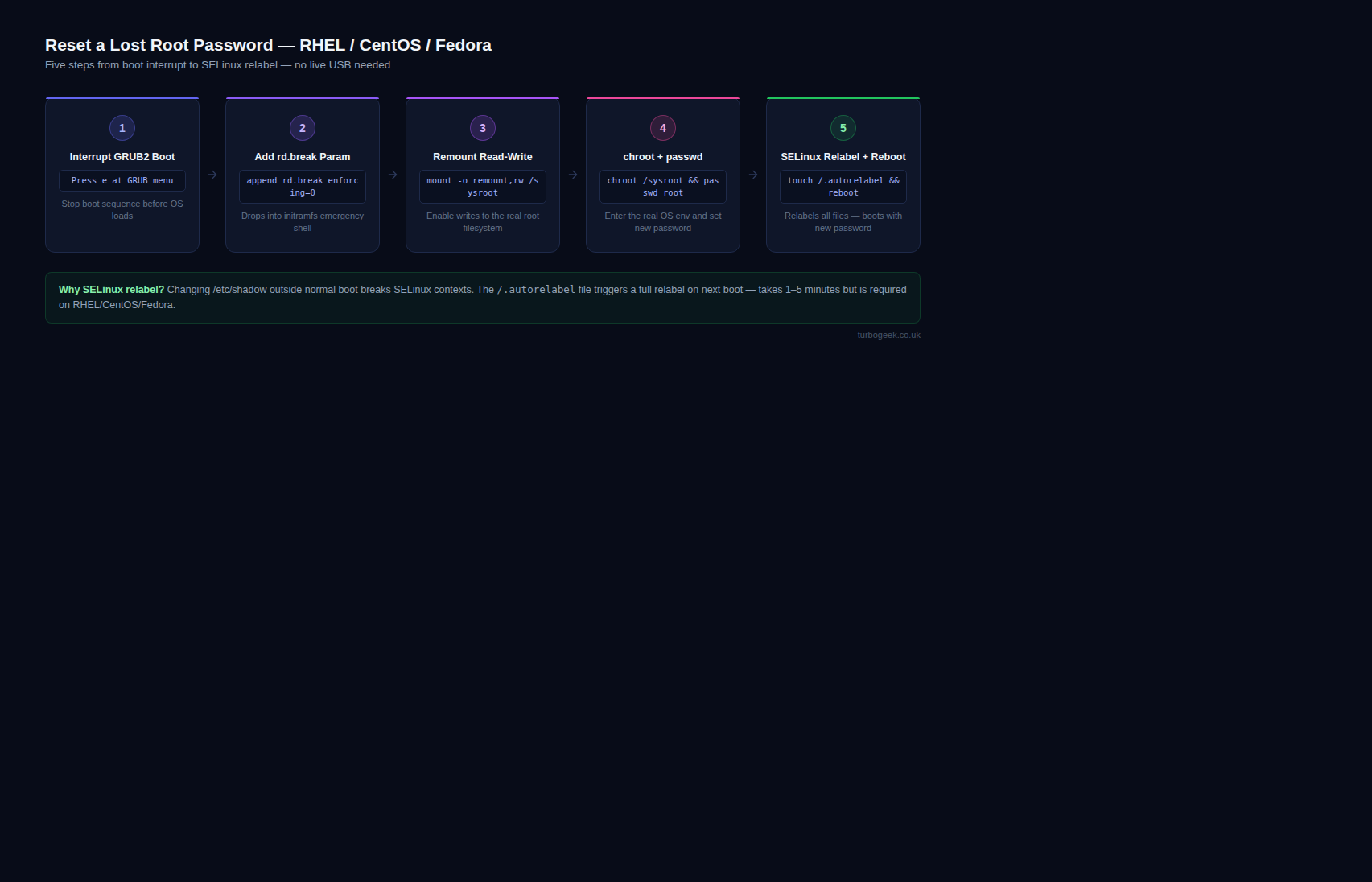 If this step is skipped, SELinux policies would prevent you from logging in with the new password, locking you out again. Once the relabeling is complete, the system will reboot a final time, and you can log in with your newly set root password.